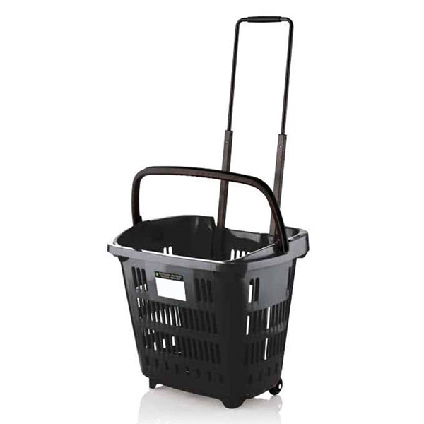 Are 2 roti, maner telescopic si maner fix.Pot fi stivuite.